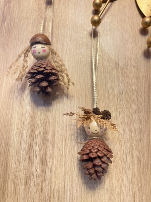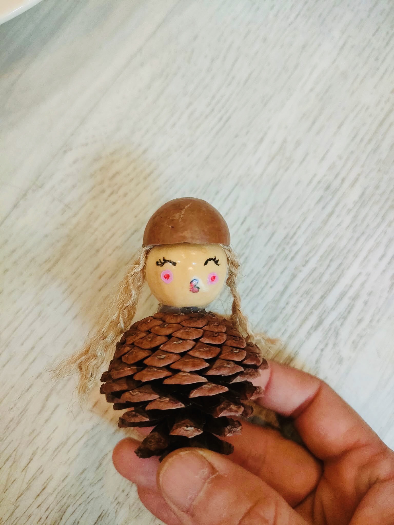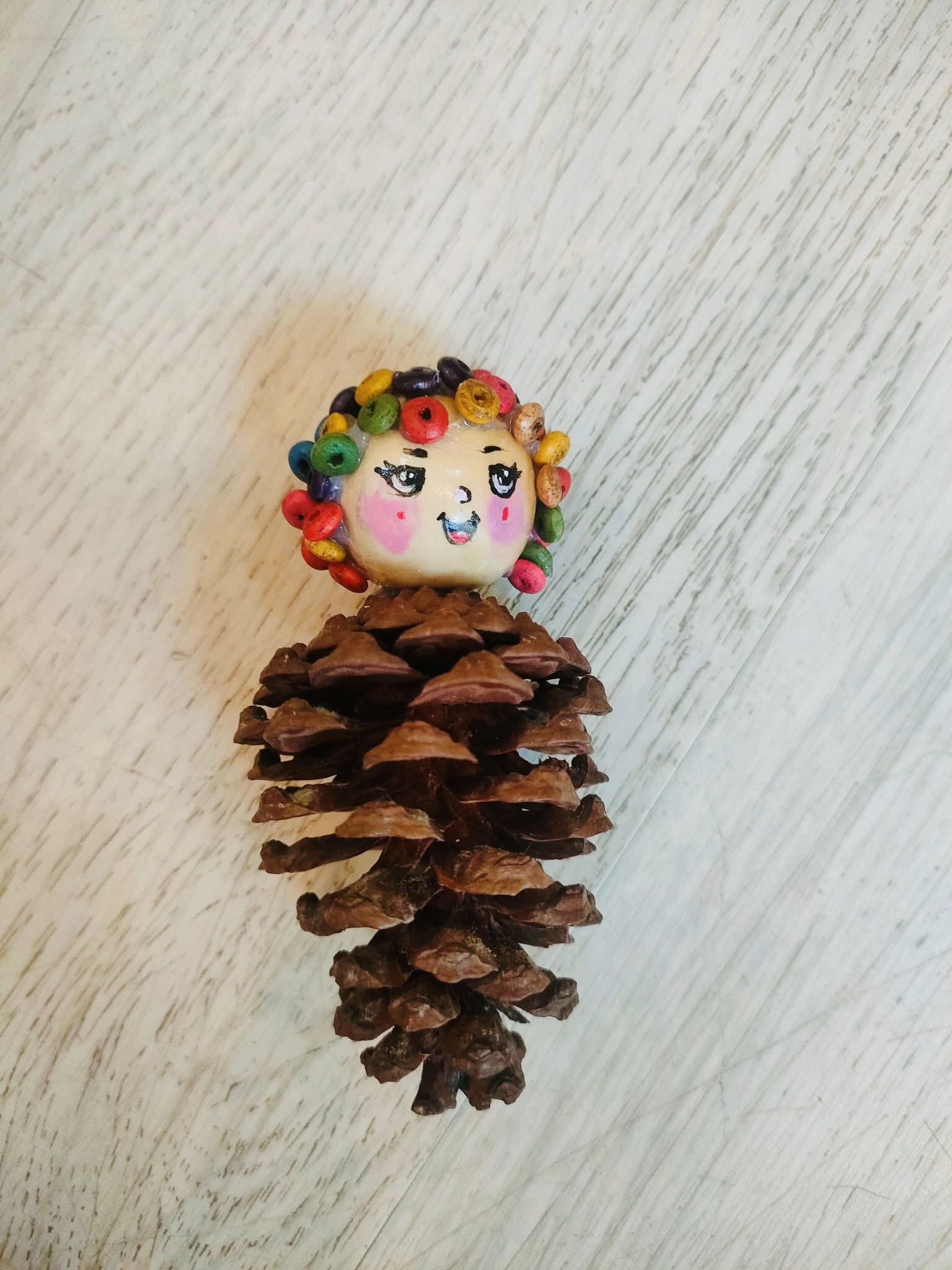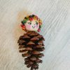 Chất liệu: Quả thông tự nhiên, đầu gỗ vẽ tay, mũ làm từ cành cây khô và nụ thông nhỏ