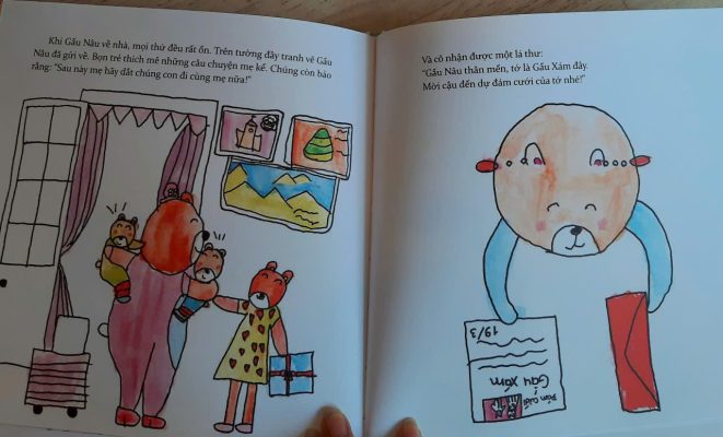 “Chuyến đi của Gấu Nâu” là sách tranh dược sáng tác bởi Gấu Mẹ Thanh Tâm và do bé Gấu Út Nhã Uyên (8 tuổi) vẽ minh họa.
