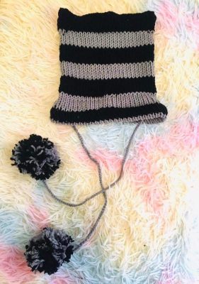 Tạo hình: Dáng mũ hình chữ nhật với hai “”tai mèo”” nhẹ nhàng ở góc trên, phối sọc đen – xám cực ngầu, kèm dây buộc có hai quả bông pom-pom xù siêu dễ thương