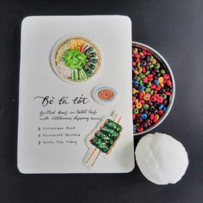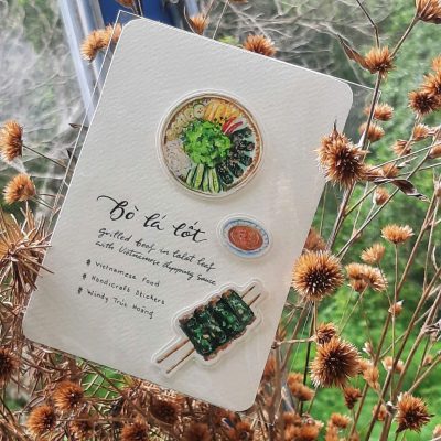 Lấy cảm hứng từ món bò lá lốt dân dã, gần gũi trong lòng người Việt, postcard được vẽ tay tỉ mỉ từng chi tiết – từ đĩa rau sống, bún, nước chấm, cho đến từng xiên bò nướng thơm lừng. Sản phẩm không chỉ là một tấm thiệp nhỏ xinh, mà còn là lời kể về văn hóa ẩm thực đặc sắc của Việt Nam.