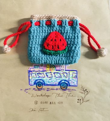 Thiết kế: Dáng túi rút, phối màu nổi bật (xanh – đỏ) kèm hình quả dưa hấu móc tay 3D nổi bật