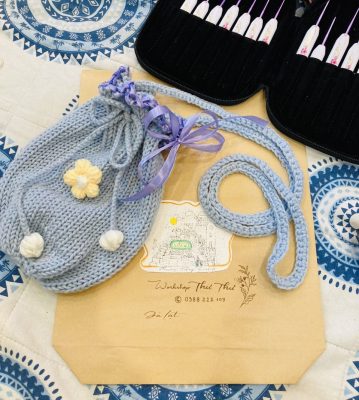 Làm hoàn toàn bằng tay (handmade), từ việc móc túi đến đính hoa và pompom trang trí.